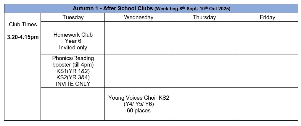 Clubs typically run on a half termly basis and operate on a ‘first come first serve’ booking basis. Letters are sent out via Parentmail.